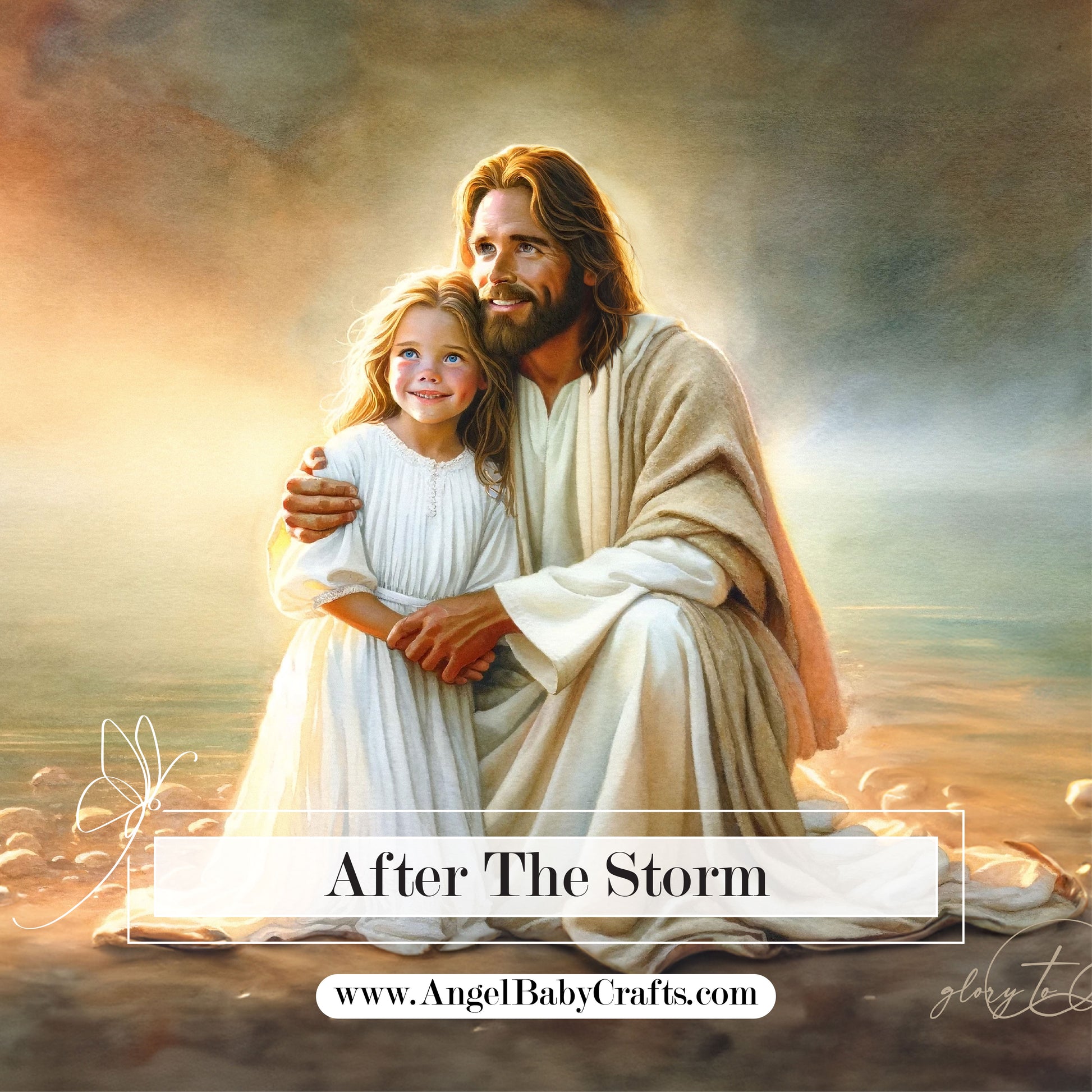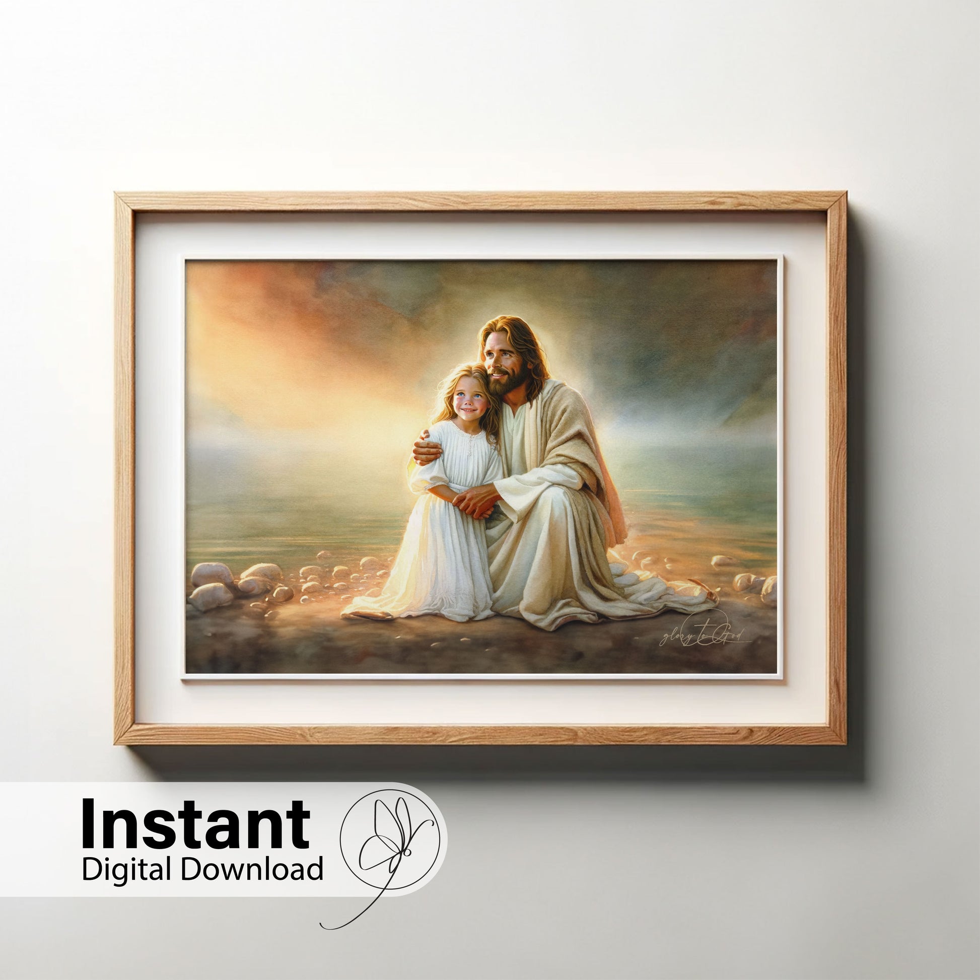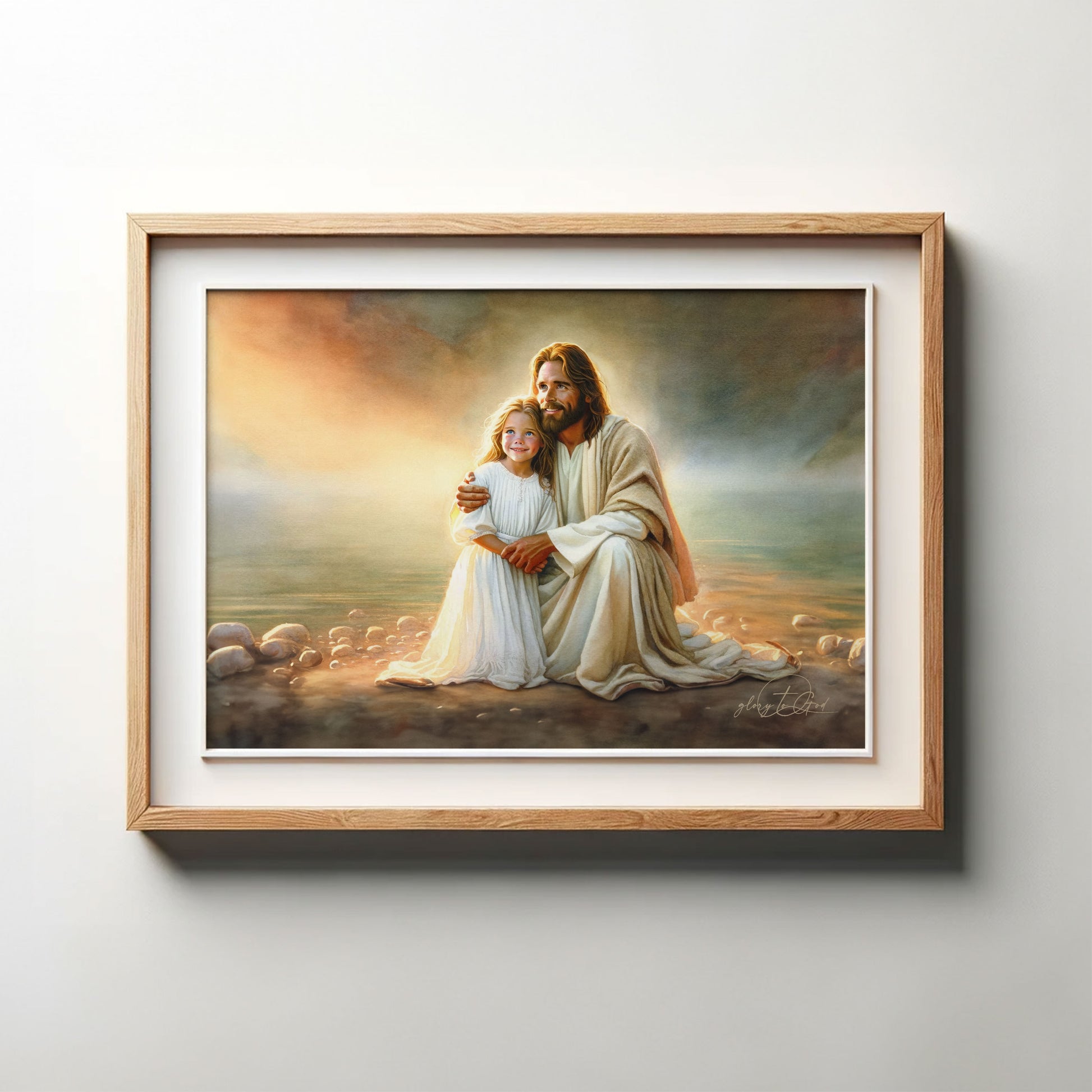 This painting beautifully captures a serene moment of a Jesus in white robes, embracing a joyful little girl with long blonde hair. The pair is bathed in warm, soft light, creating an atmosphere of peace and comfort.