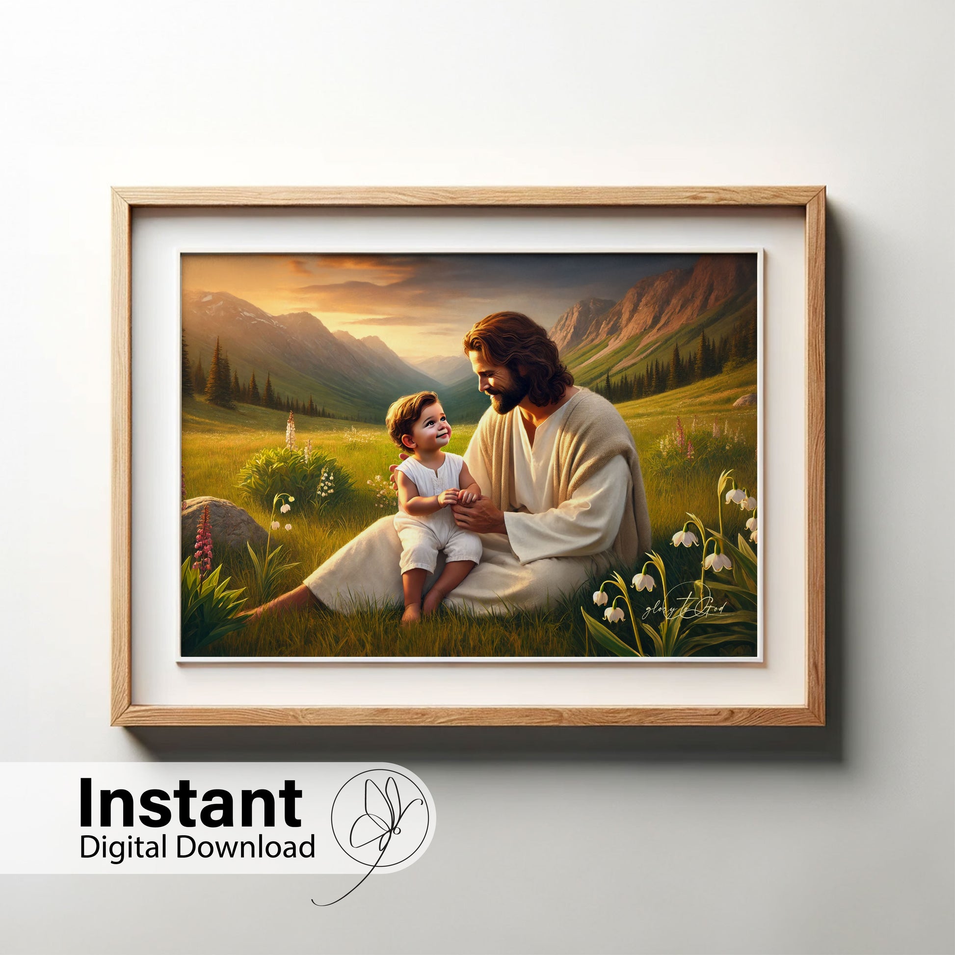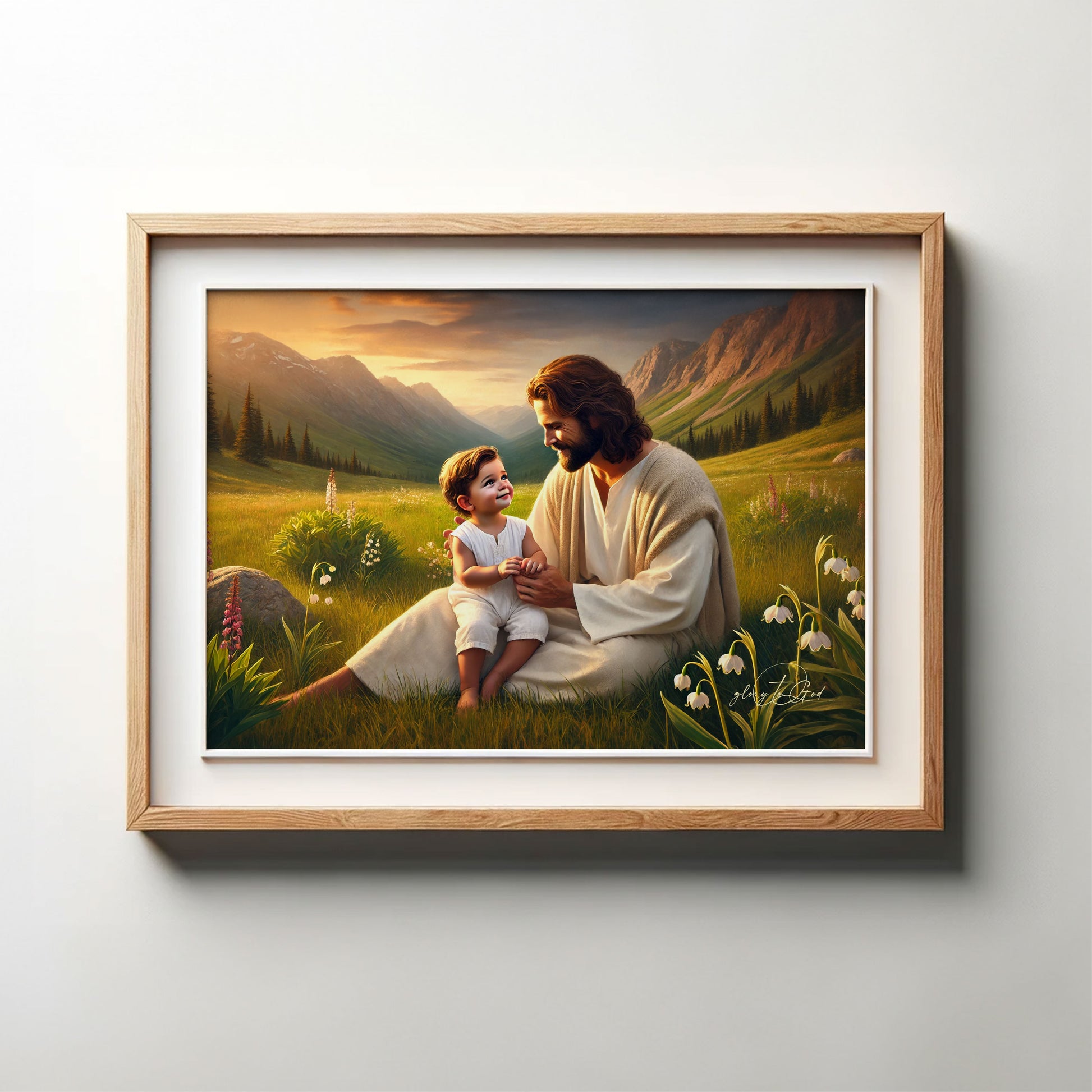 This painting beautifully captures a serene and tender moment between Jesus in white robes and a young boy with short brown hair. Seated together in a lush meadow surrounded by wildflowers, the child looks up with a joyful expression while holding the figure's hands.