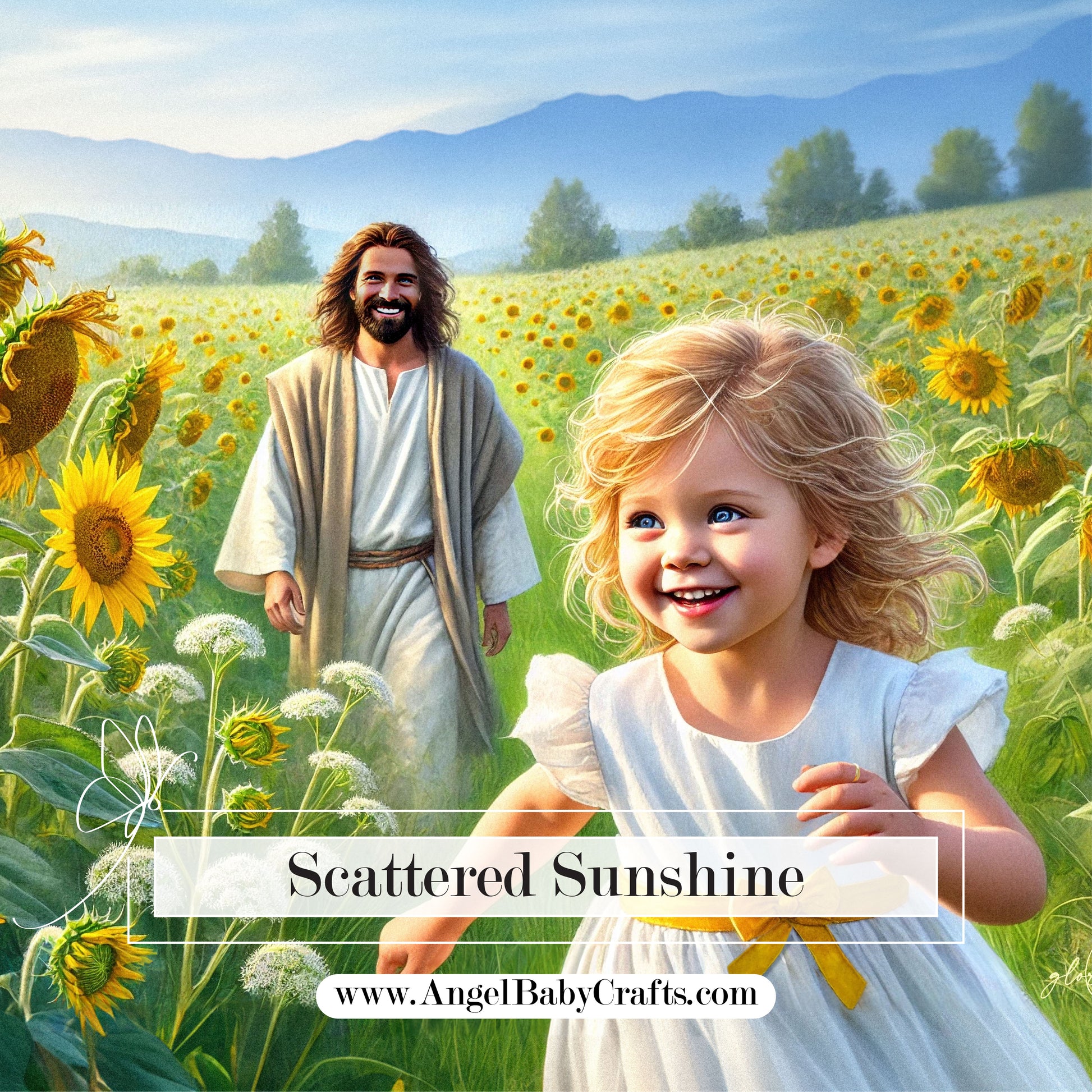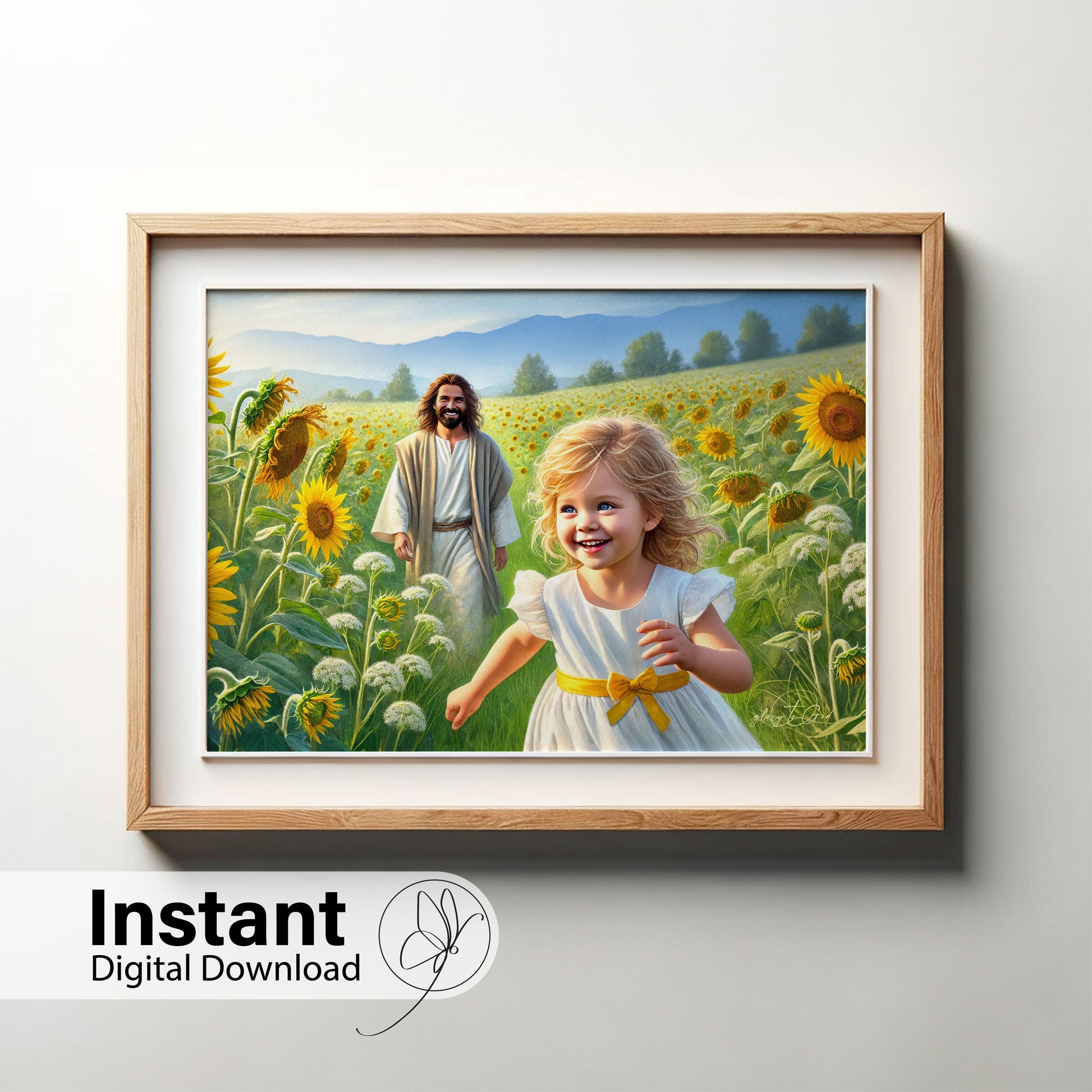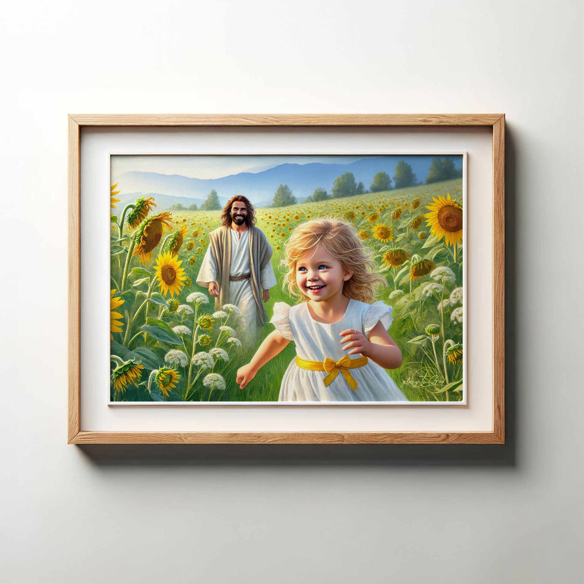 Behind her, Jesus walks calmly with a smile, exuding love and protection. The scene is filled with sunlight, enhancing the cheerful atmosphere, and the background of blooming sunflowers adds to the feeling of happiness and hope.