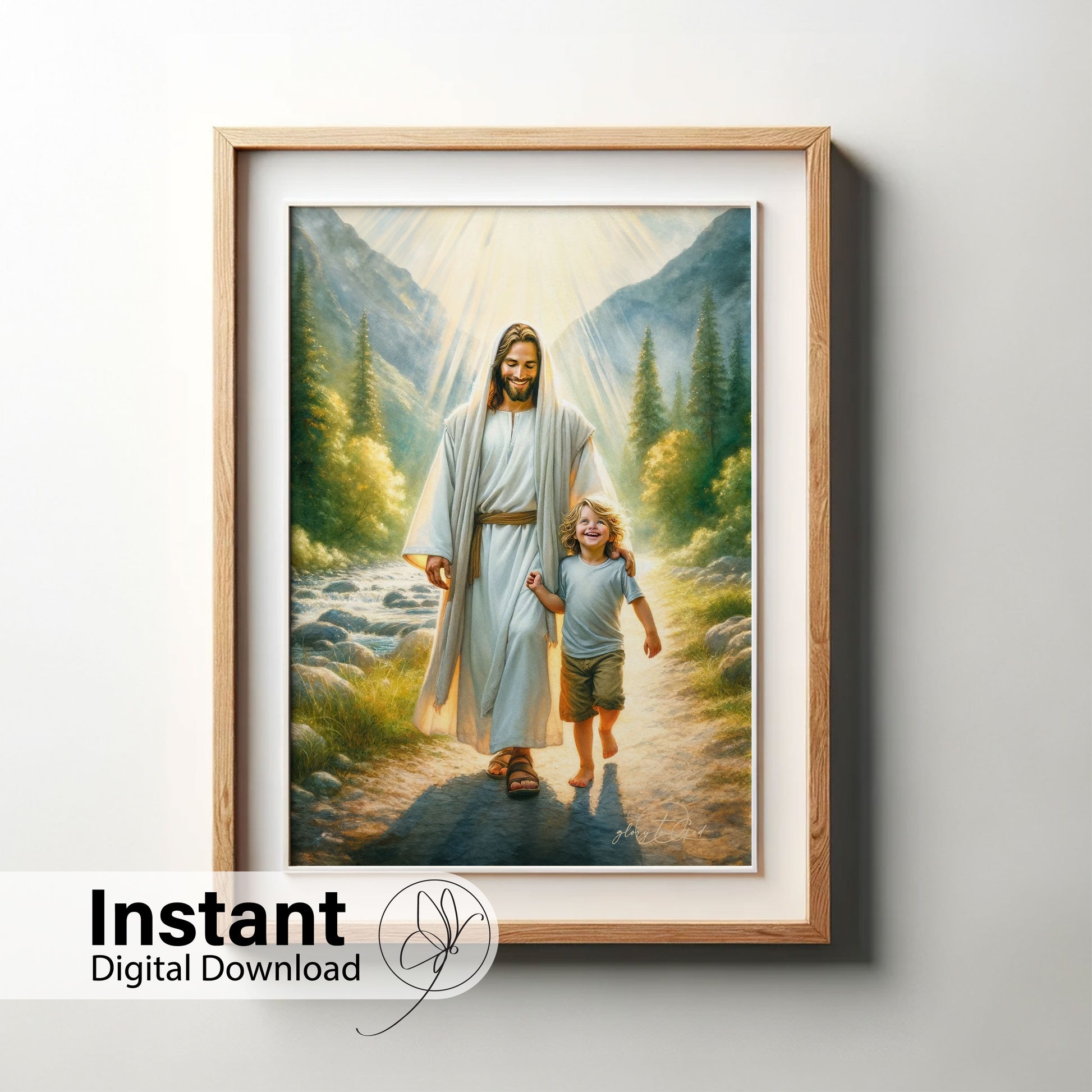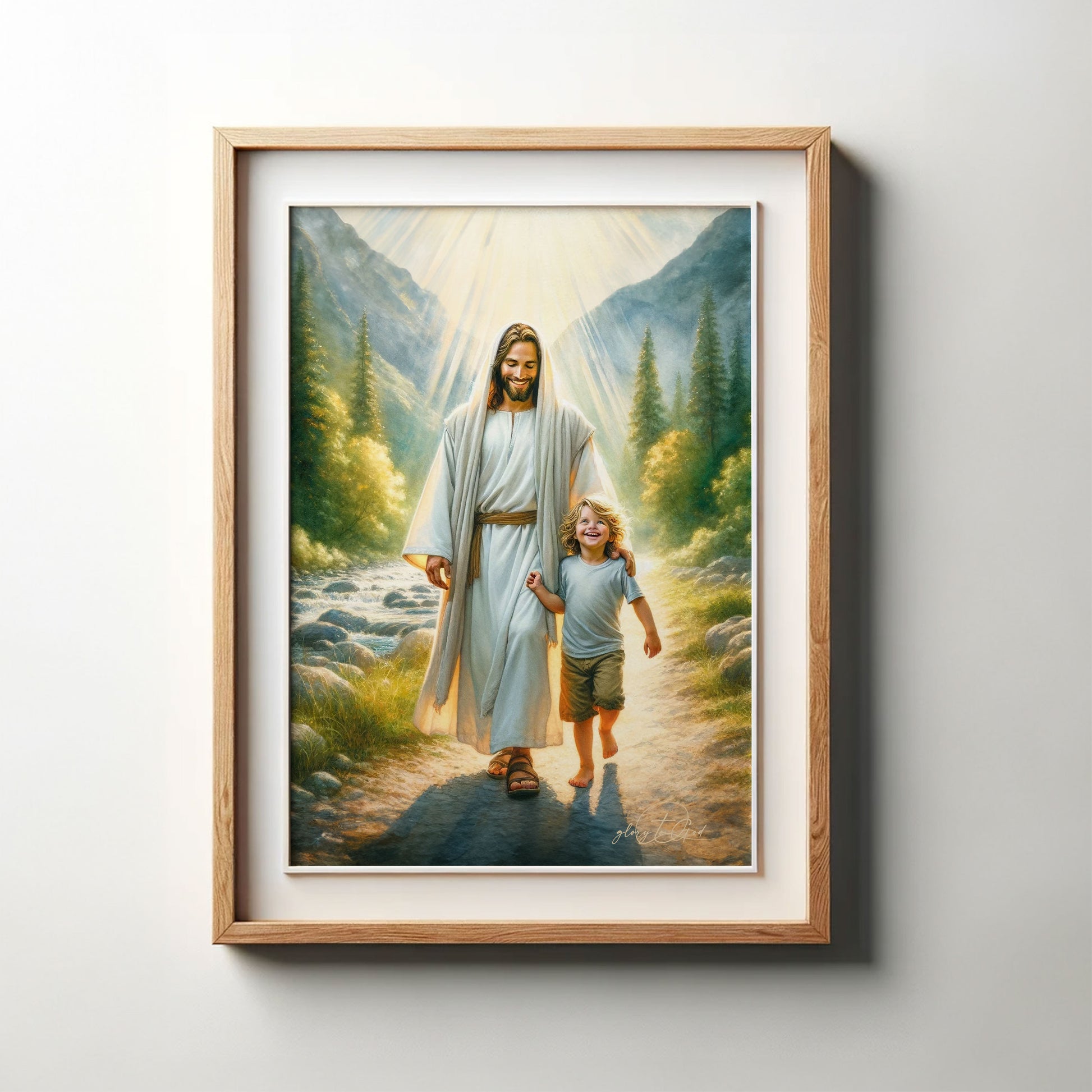 This painting depicts a heartwarming scene of Jesus walking alongside a joyful young boy with curly blonde hair. The boy, dressed in a light blue shirt and shorts, smiles brightly as he walks barefoot on a sunlit path beside a flowing stream.