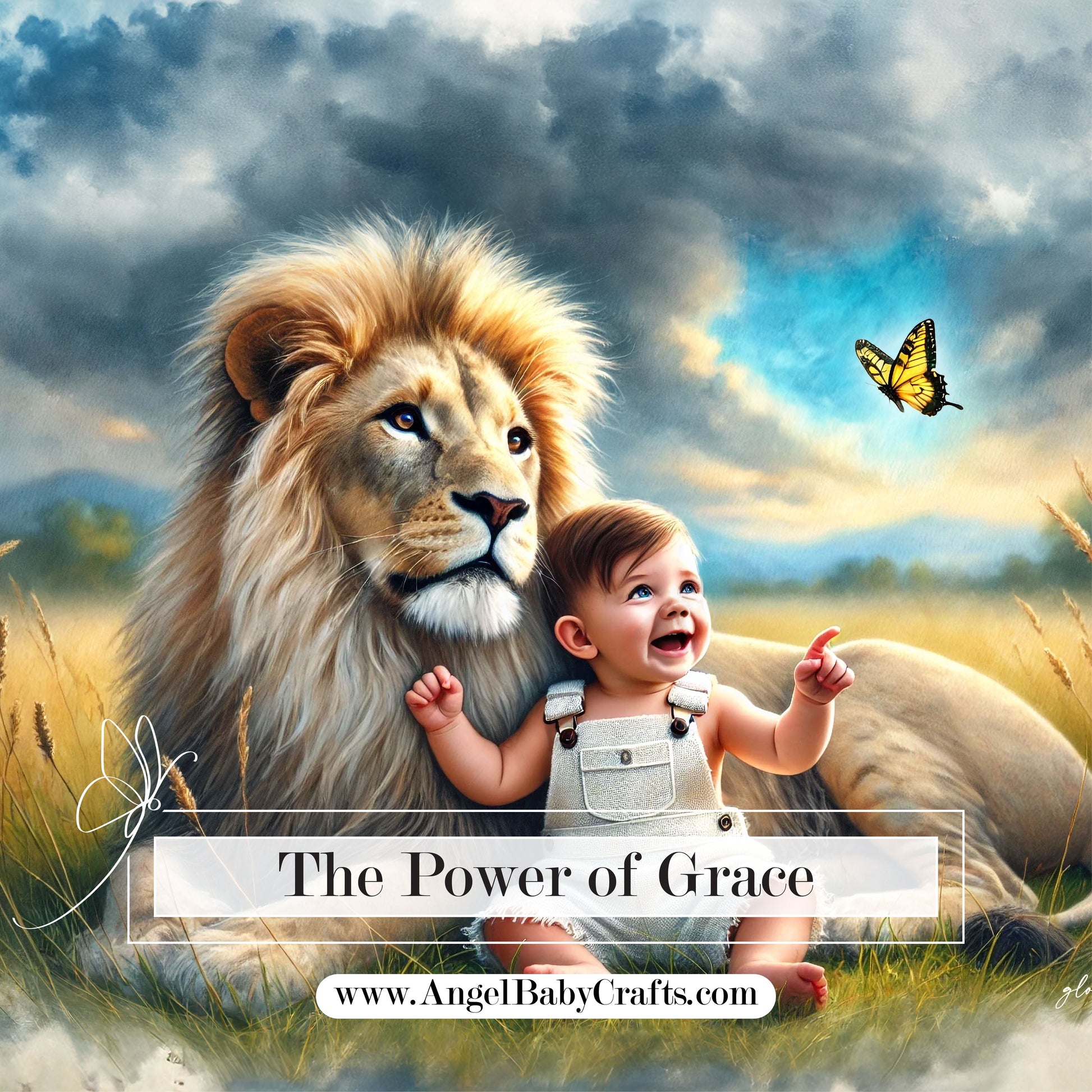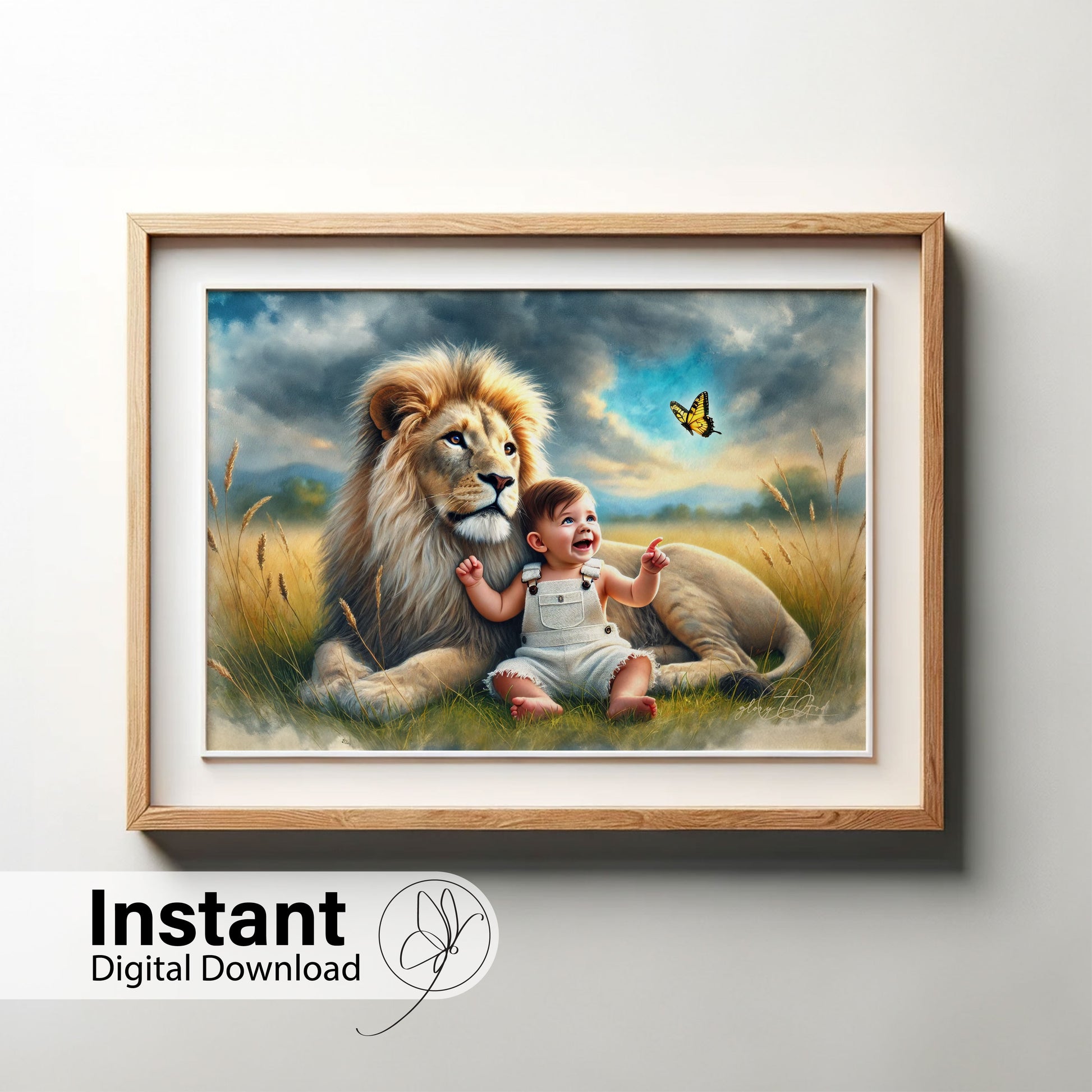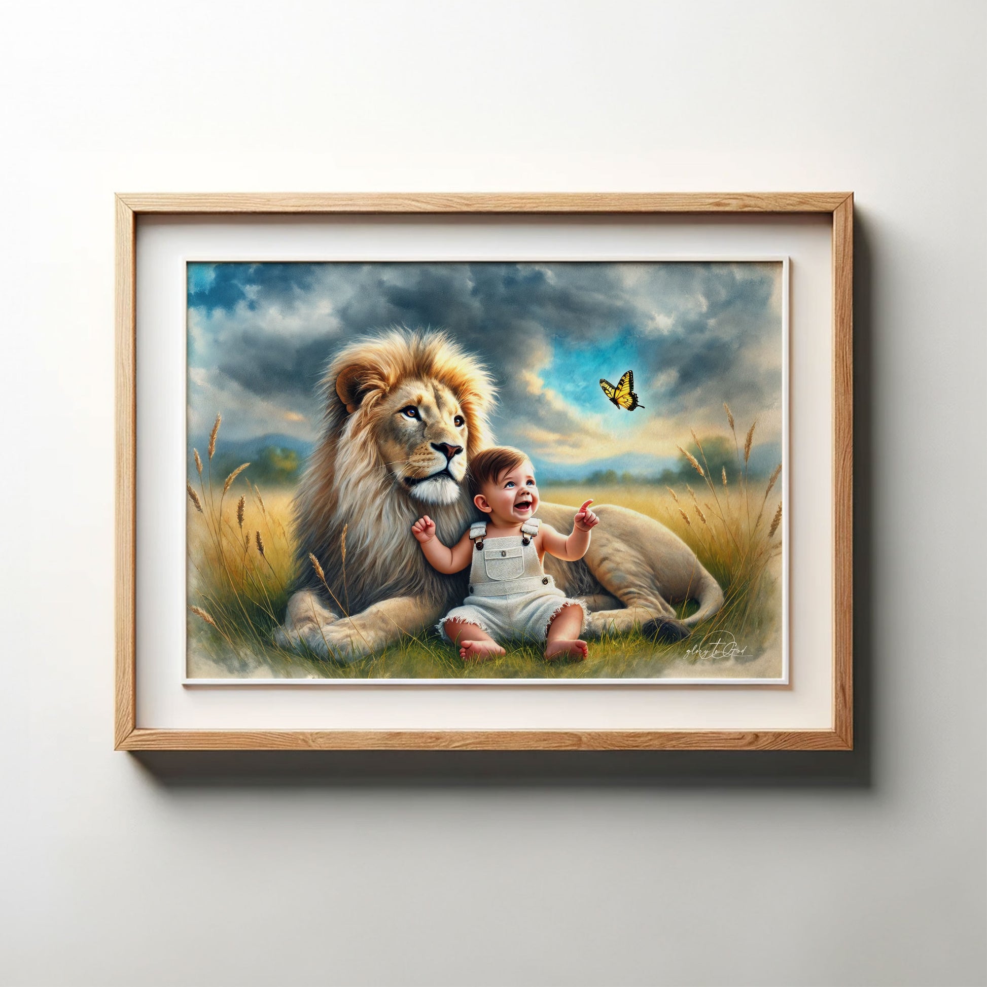 The baby smiles joyfully and points at a small yellow swallowtail butterfly (Representing Resurrection) flying by, while the lion looks calm and protective.